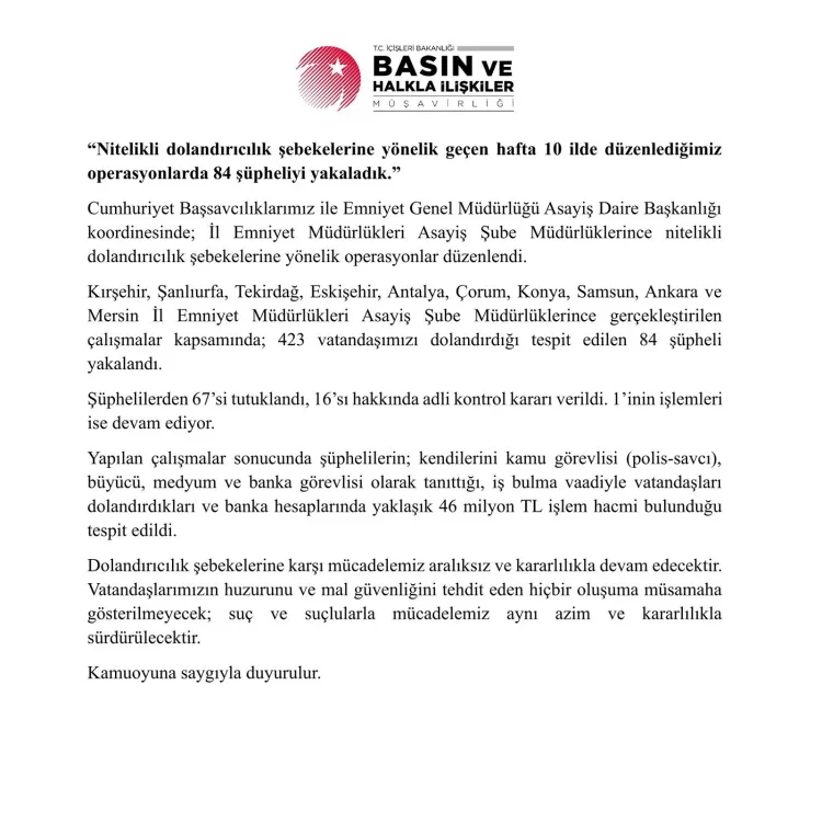 İçişleri Bakanlığı koordinasyonunda 10 ilde düzenlenen operasyonlarda 423 vatandaşı dolandırdığı belirlenen 84 şüpheli gözaltına alındı. Şüphelilerin hesaplarında yaklaşık 46 milyon TL’lik işlem hacmi tespit edildi.