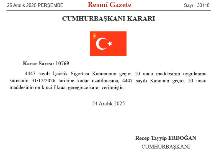 ANKARA (İGFA) - Bugünkü Resmi Gazete'de yayımlanan Cumhurbaşkanı Kararı ile 4447 sayılı İşsizlik Sigortası Kanunu'nun Geçici 10 uncu Maddesi'nin uygulanma süresi uzatıldı.