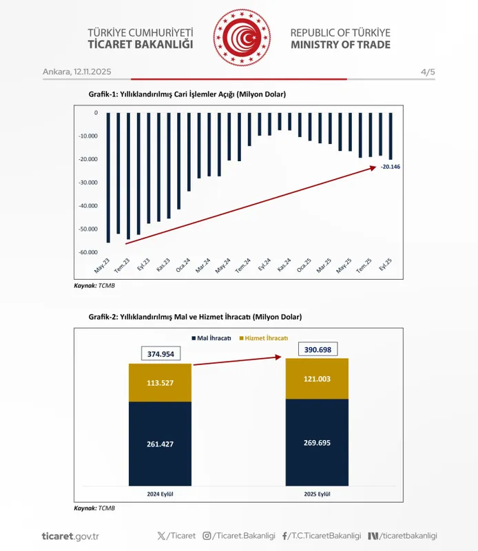 Ticaret Bakanı Ömer Bolat, TCMB’nin eylül ayı ödemeler dengesi verilerini değerlendirdi. Bakan Bolat, hem mal hem hizmet ihracatında güçlü artış kaydedildiğini ve cari işlemler dengesinin istikrarını koruduğunu açıkladı.