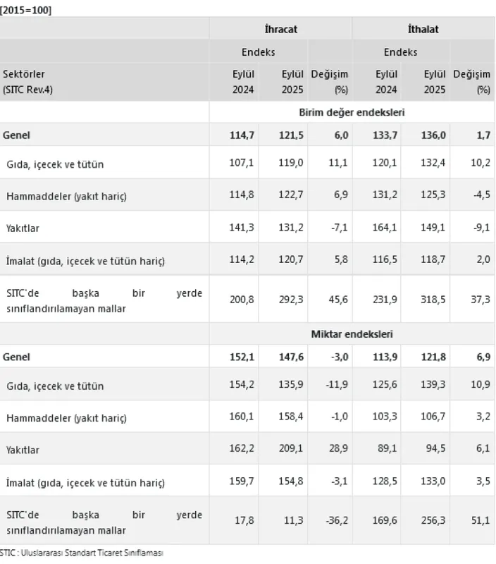 Böylece dış ticaret haddi, 2024 Eylül’deki 85,8 seviyesinden 2025 Eylül’de 89,4’e yükseldi.