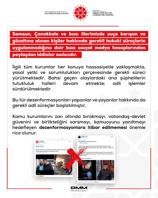 Samsun, Çanakkale ve bazı illerde yaşanan olaylarla ilgili sosyal medyada yayılan iddialara yanıt veren Dezenformasyonla Mücadele Merkezi, paylaşımların asılsız olduğunu ve adli süreçlerin devam ettiğini açıkladı.