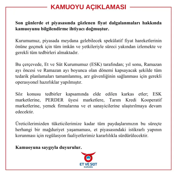 ANKARA (İGFA) - Et ve Süt Kurumu (ESK), et fiyatlarındaki dalgalanmalar üzerine kamuoyunu bilgilendirme ihtiyacı duydu.