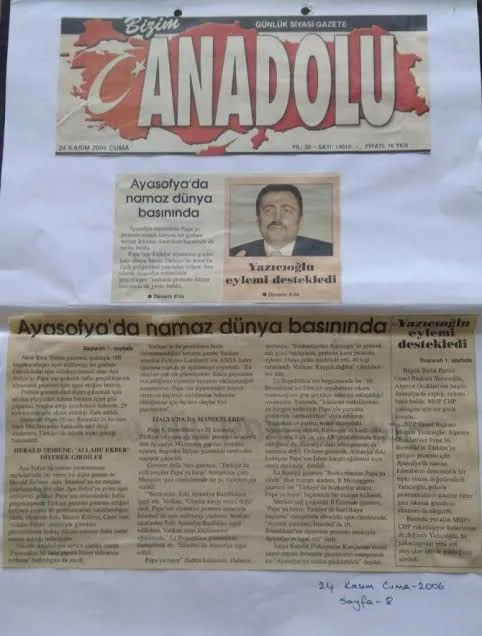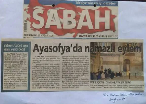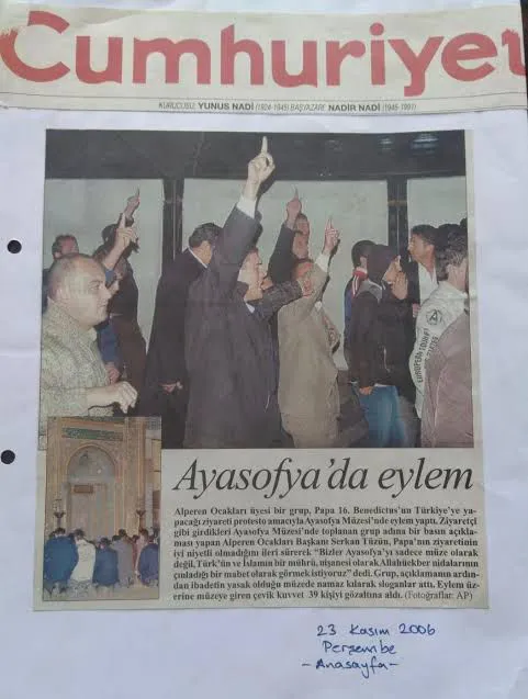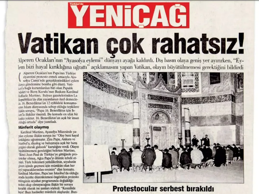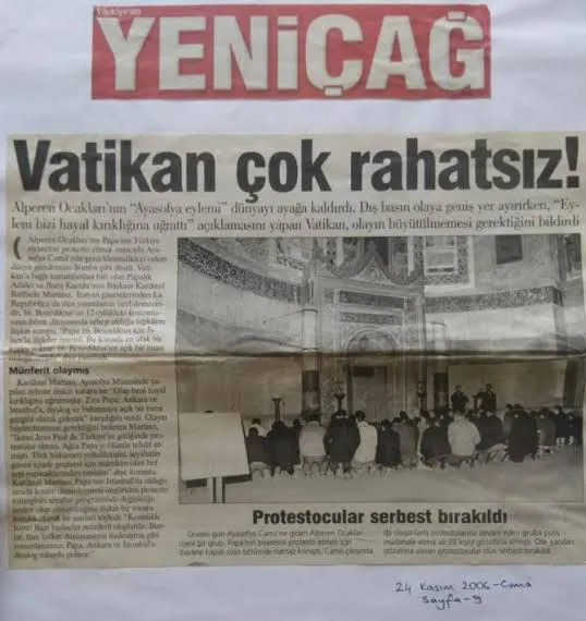 ''Bu ziyaret öncesinde Papa'nın Ayasofya'da dua etmek istediği ve Ayasofya'yı kutsamak istediği deşifre oldu. Alperen Ocakları'na mensup gençlerin camide namaz kılarak gösterdiği bu demokratik tepkisi sonrasında Papa'nın Ayasofya'da dua edip Ayasofya'yı kutsama girişimi tamamen ortadan kalktı. Bu gelişme sonrasında Türk devletinin, hükümetinin daha duyarlı hale gelmesi sağlanmıştır. Bu gençlerin Ayasofya'da namaz kılması Ayasofya'nın statüsü konusundaki tartışmaları yeniden gündeme getirmiştir. Fatih'in Türk milletine armağanı olan Ayasofya camisinde gençlerin namaz kılmasını bile içlerine sindiremeyenler her halde Papa'nın Ayasofya'da dua etmesine alkış tutacak değiller. Ayasofya bizimdir. Papa, Ayasofya’da dua edemez. Papa’ya da biber gazı sıkılacak mı?”