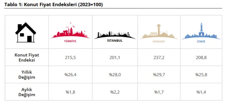 Konut Fiyat Endeksi, şubat ayında bir önceki aya göre yüzde 1,8 artarak 215,5 seviyesine yükseldi. Yıllık bazda ise yüzde 26,4 oranında artış kaydedildi. Ancak aynı dönemde reel olarak yüzde 3,9 düşüş yaşandı. Bu durum, konut fiyatlarındaki artışın enflasyonun gerisinde kaldığını ortaya koydu.