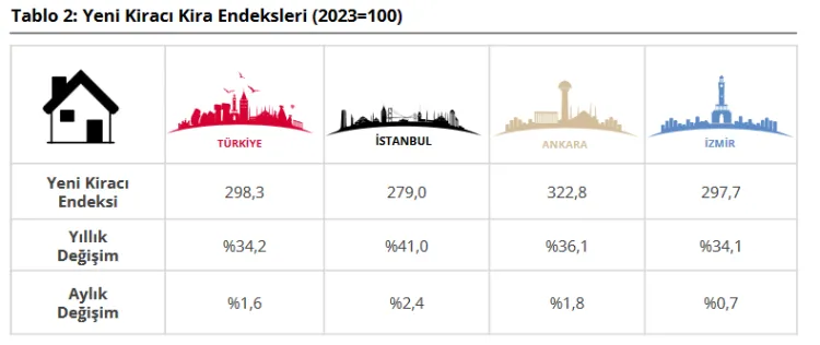 Üç büyük şehirde kira artışları da hız kesmedi. İstanbul’da kiralar aylık yüzde 2,4, Ankara’da yüzde 1,8 ve İzmir’de yüzde 0,7 arttı. Yıllık artış ise İstanbul’da yüzde 41,0 ile en yüksek seviyeye ulaşırken, Ankara’da yüzde 36,1 ve İzmir’de yüzde 34,1 olarak gerçekleşti.