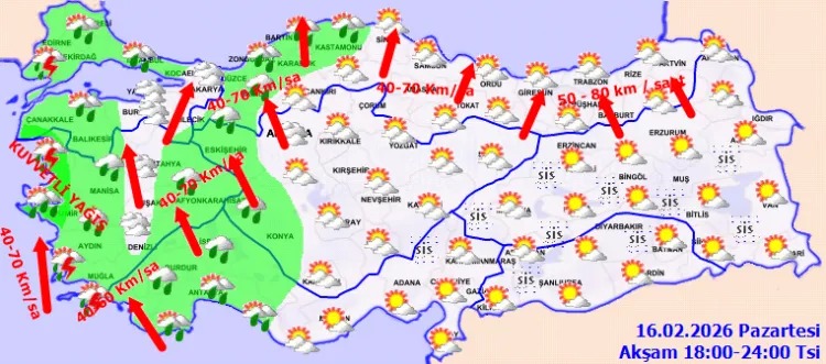 Rüzgar genellikle güneyli yönlerden, hafif ara sıra orta kuvvette, Marmara, Ege, Batı Akdeniz, İç Anadolu ile Karadeniz'in iç kesimlerinin kuvvetli ve kısa süreli fırtına (40-80 km/saat) şeklinde esmesi bekleniyor.