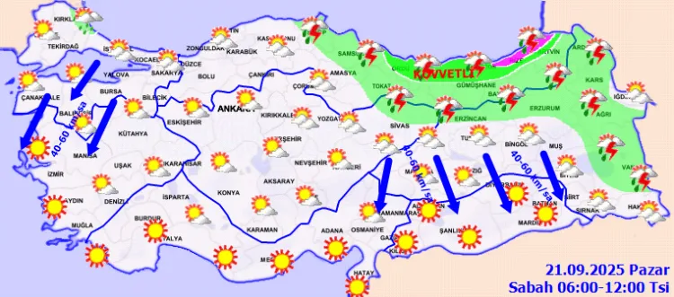 ANKARA (İGFA) - Meteoroloji Genel Müdürlüğü, 21 Eylül 2025 Pazar günü için hava durumu tahminlerini ve uyarılarını açıkladı.
