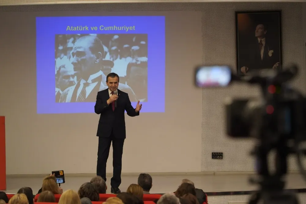 Konuşmaların ardından kürsüye davet edilen Emekli Tuğgeneral Naim Babüroğlu, “Atatürk ve Cumhuriyet” başlıklı söyleşisini gerçekleştirdi. Babüroğlu, Türkiye Cumhuriyeti’nin kuruluş sürecini, Atatürk’ün askerlik ve devlet adamlığı yönünü, ulusal egemenlik ilkesini ve Cumhuriyet’in temel değerlerini tarihsel örnekler eşliğinde anlattı. Atatürk’ün sadece bir komutan değil, aynı zamanda ileri görüşlü bir lider ve düşünce insanı olduğuna vurgu yapan Babüroğlu, genç kuşakların Cumhuriyet kazanımlarını iyi anlaması gerektiğinin altını çizdi.