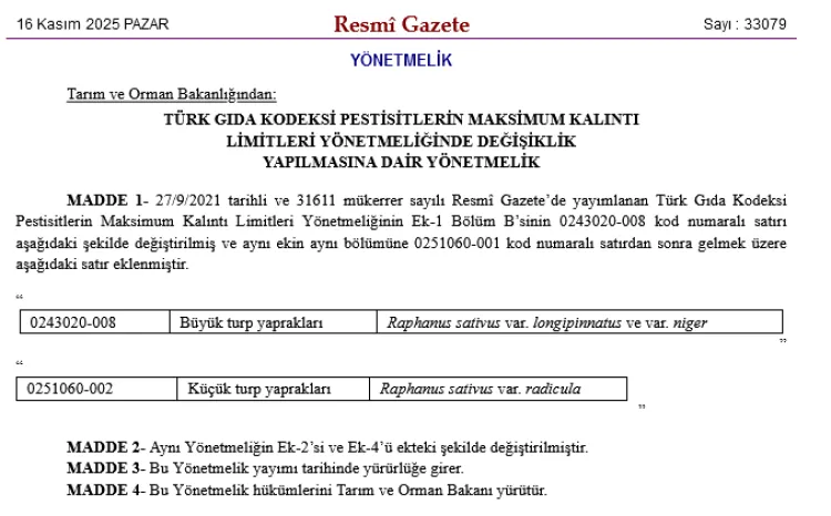 Bugünkü Resmi Gazete’de yayımlanan yönetmelik değişikliğiyle Türk Gıda Kodeksi Pestisitlerin Maksimum Kalıntı Limitleri Yönetmeliği’nde turp yaprakları için düzenlemeler yapıldı. Büyük ve küçük turp yaprakları ile ilgili kodlar eklenirken, Ek-2 ve Ek-4 tabloları revize edildi, gıda güvenliği standartları yükseltildi.
