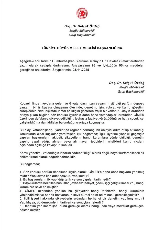 Yeni Yol Grubu Grup Başkanvekili ve Muğla Milletvekili Doç. Dr. Selçuk Özdağ, Kocaeli’de meydana gelen ve 6 vatandaşın yaşamını yitirdiği parfüm deposu yangınıyla ilgili olarak Cumhurbaşkanı Yardımcısı Dr. Cevdet Yılmaz’ın yanıtlaması istemiyle Türkiye Büyük Millet Meclisi’ne yazılı soru önergesi sundu. Özdağ, olayın yalnızca bir iş kazası olarak değil, aynı zamanda kamu denetim ve gözetim mekanizmalarının ciddi biçimde ihmal edildiğini gösteren bir trajedi olarak değerlendirilmesi gerektiğini vurguladı.