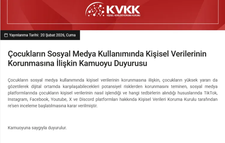 Kişisel Verileri Koruma Kurulu, çocukların kişisel verilerinin korunması amacıyla TikTok, Instagram, Facebook, YouTube, X ve Discord hakkında re’sen inceleme başlattı.