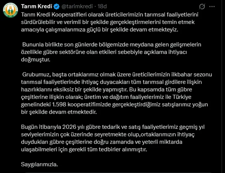 Tarım Kredi Kooperatifleri, son dönemde gübre sektörüne ilişkin yaşanan gelişmeler üzerine açıklama yaptı. Kurum, 2026 yılı gübre tedarik ve satış faaliyetlerinin geçmiş yılların üzerinde seyrettiğini bildirdi.