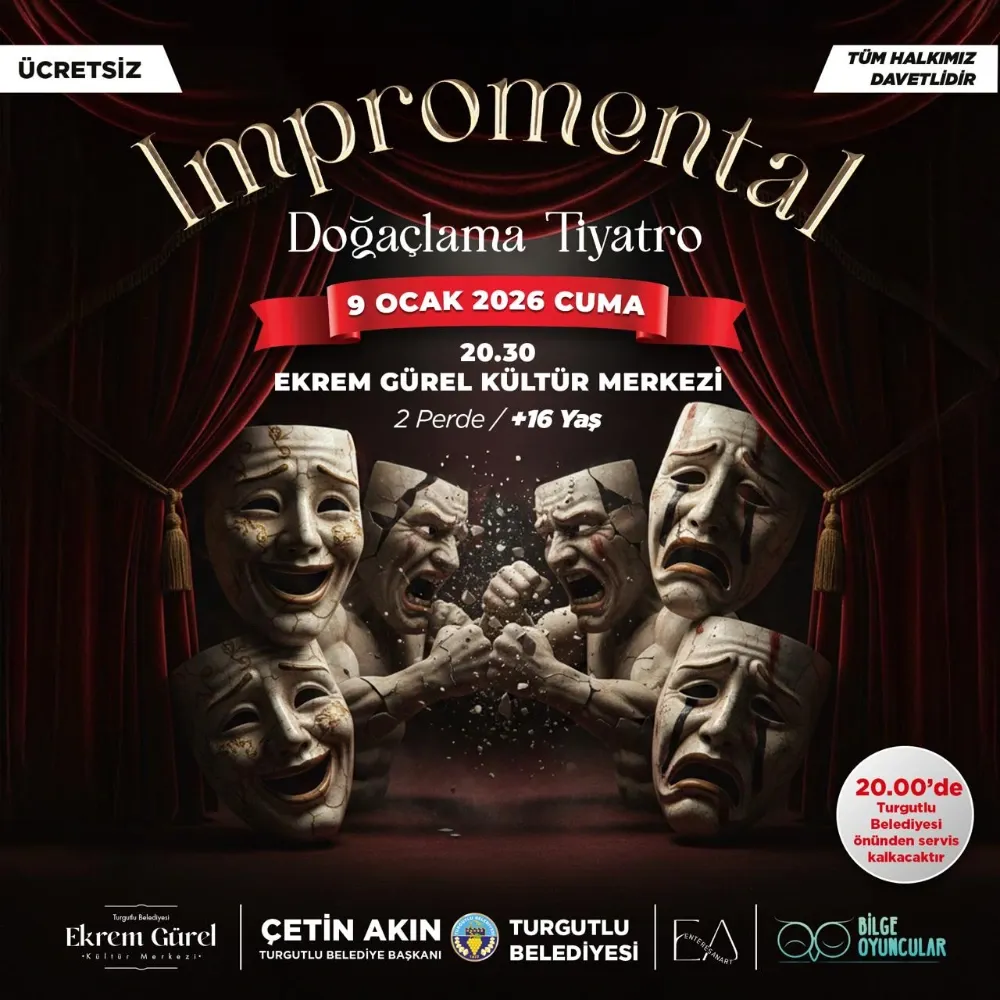 (MHA)      Turgutlu Belediyesi, kültür ve sanat faaliyetlerini artırmaya yönelik çalışmalarını yeni etkinliklerle sürdürüyor. Kentte tiyatroya olan ilgiyi canlı tutmayı hedefleyen belediye, bu kez de doğaçlama tiyatro türünün enerjisini Turgutlulularla buluşturacak. Turgutlu Belediyesi Ekrem Gürel Kültür Merkezi, Bilge Oyuncular ve Enterasanart iş birliğiyle sahnelenecek “Impromental Doğaçlama Tiyatro” oyununa ev sahipliği yapacak. Gösteri, 9 Ocak Cuma günü saat 20.30’da tiyatroseverlerle buluşacak.