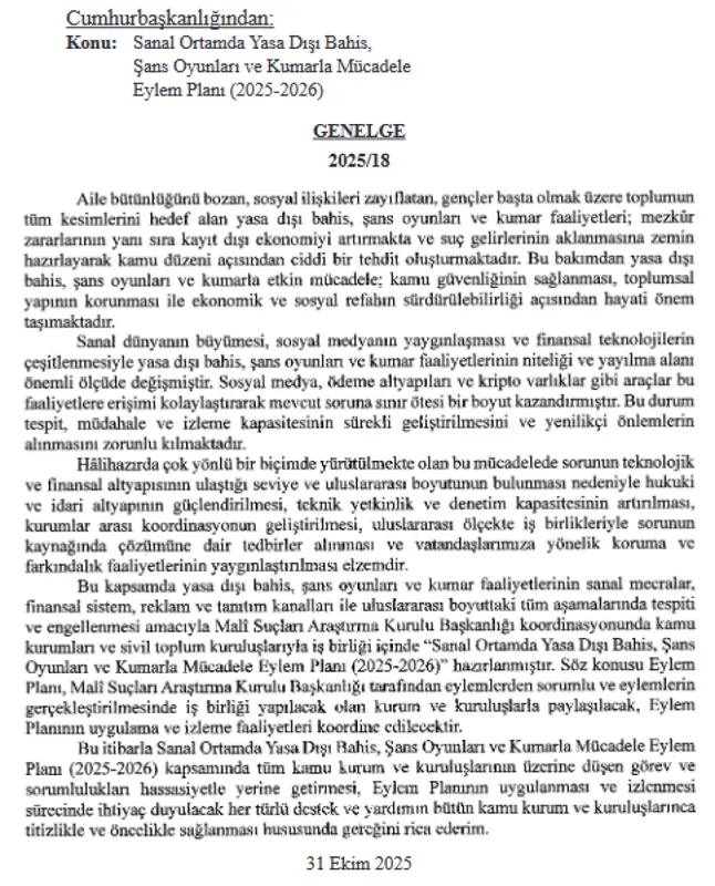 Cumhurbaşkanı Erdoğan imzalı genelge Resmi Gazete'de yayımlandı. MASAK koordinasyonunda sanal mecralar, finans ve reklam kanallarında yasa dışı bahis ve kumar engellenecek.
