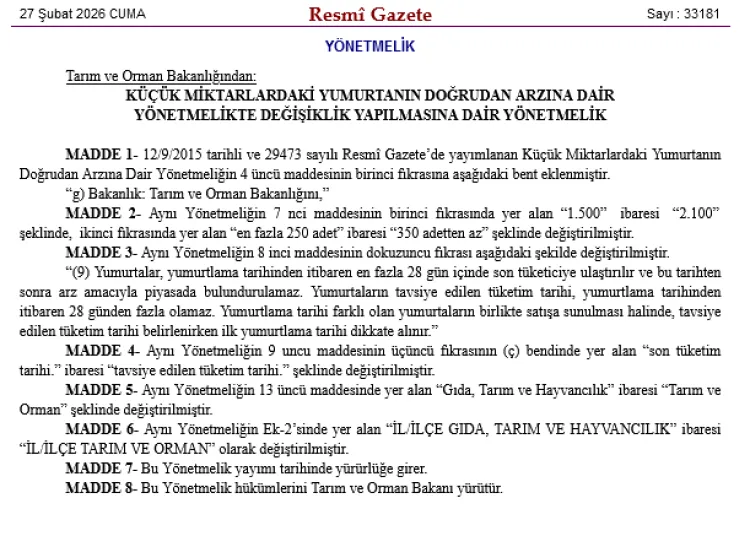 ANKARA (İGFA) - Tarım ve Orman Bakanlığı tarafından hazırlanan “Küçük Miktarlardaki Yumurtanın Doğrudan Arzına Dair Yönetmelikte Değişiklik Yapılmasına Dair Yönetmelik”, bugünkü Resmi Gazete’de yayımlanarak yürürlüğe girdi.