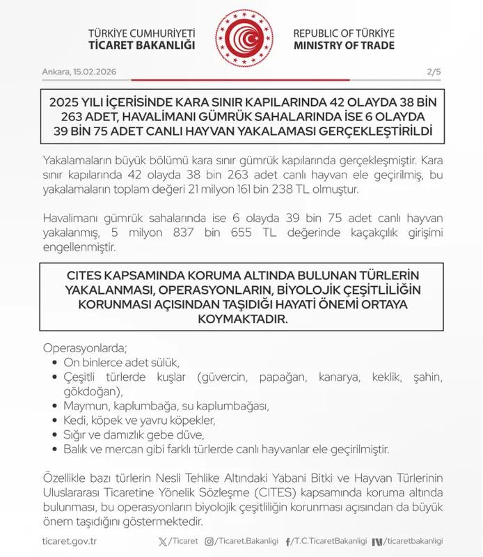 Yakalanan türler arasında, CITES (Nesli Tehlike Altındaki Yabani Bitki ve Hayvan Türlerinin Uluslararası Ticaretine İlişkin Sözleşme) kapsamında koruma altında bulunan canlıların da yer aldığı belirtildi. Bakanlık, bu operasyonların yalnızca kaçakçılıkla mücadele değil, aynı zamanda biyolojik çeşitliliğin korunması açısından da hayati önem taşıdığına dikkat çekti.