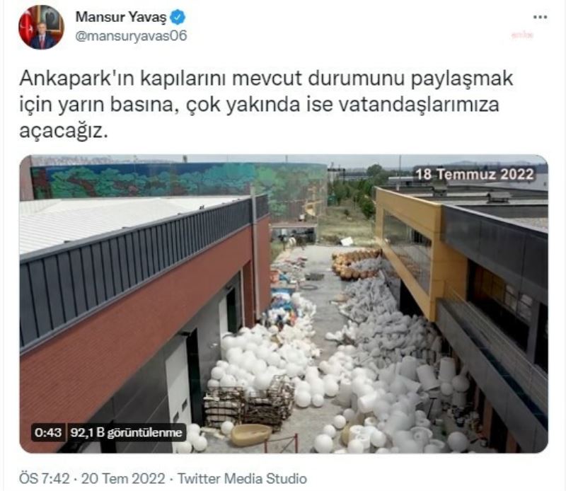 Yavaş, sosyal medya hesabından, “Ankapark'ın kapılarını mevcut durumunu paylaşmak için yarın basına, çok yakında ise vatandaşlarımıza açacağız” açıklamasını yaptı. Yavaş’ın paylaştığı videonun sonunda “Detaylar yakında kamuoyu ile paylaşılacak” ifadeleri kullanıldı.