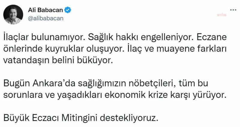 Ali Babacan, bugün Ankara’da miting düzenleyen eczacilara, sosyal medya hesabinda yaptigi paylasimla destek verdi. Babacan’in paylasimi söyle: