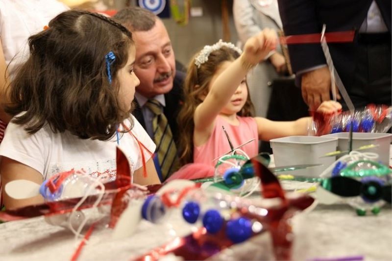 Körfez KO-MEK sergisine katılan Başkan Büyükakın, çocuk oyun odasında eğitim gören çocukların hayallerini makete dönüştürdüğü ürünleri çok beğendi