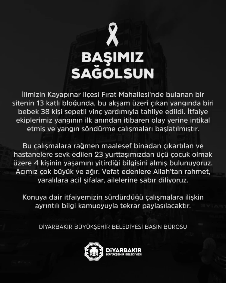 Diyarbakır’ın Kayapınar ilçesinde bir sitenin 13 katlı bloğunda çıkan yangında anne ve üç çocuğu hayatını kaybetti. Diyarbakır Büyükşehir Belediyesi, 38 kişinin kurtarıldığını, itfaiyenin çalışmalara devam ettiğini bildirirken, Adalet Bakanı Yılmaz Tunç, olayla ilgili adli soruşturmanın titizlikle yürütüldüğünü duyurdu.