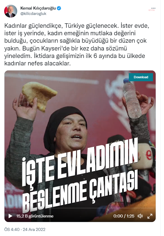 Kılıçdaroğlu’nun “Kadınlar güçlendikçe, Türkiye güçlenecek. İster evde, ister iş yerinde, kadın emeğinin mutlaka değerini bulduğu, çocukların sağlıkla büyüdüğü bir düzen çok yakın. Bugün Kayseri'de bir kez daha sözümü yineledim. İktidara gelişimizin ilk 6 ayında bu ülkede kadınlar nefes alacaklar” notuyla yayınladığı videoda Kartal’ın şu sözlerine yer verildi: