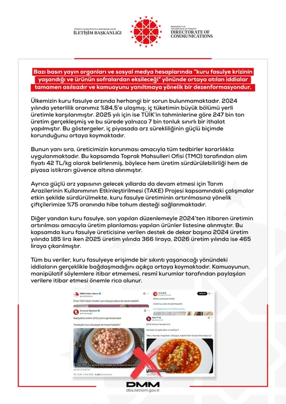 İletişim Başkanlığı Dezenformasyonla Mücadele Merkezi (DMM), bazı medya organlarında yer alan “kuru fasulyenin sofralardan eksileceği” yönündeki haberlerin gerçeği yansıtmadığını duyurdu.