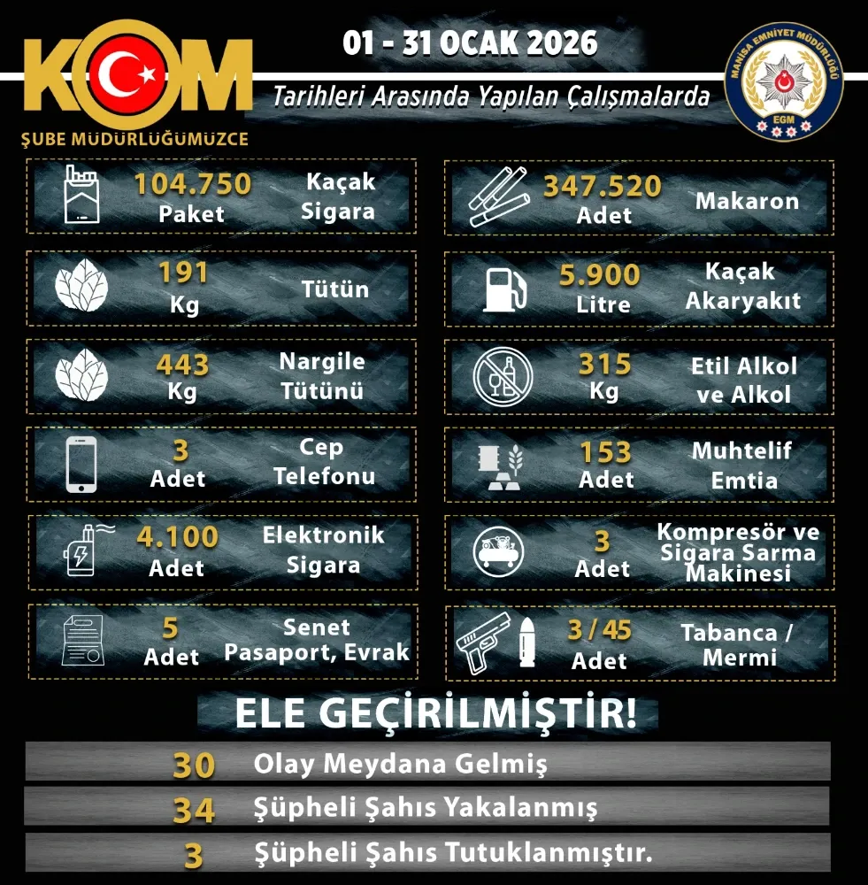 Manisa İl Emniyet Müdürlüğü’nün Ocak 2026 boyunca yürüttüğü operasyonlarda 30 olayda 34 şüpheli yakalanırken, çok sayıda kaçak sigara, akaryakıt ve elektronik sigara ele geçirildi.