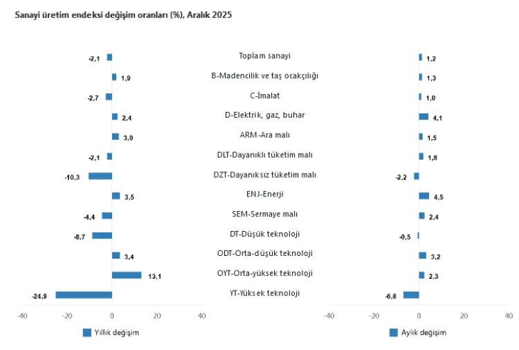 TÜİK, 2025 yılının Aralık ayına ilişkin Sanayi Üretim Endeksi verilerini yayımladı. Verilere göre sanayi üretimi aylık bazda artış gösterirken, yıllık bazda imalat sanayindeki düşüş dikkat çekti. Veriler imalat sanayinde yıllık bazda yaşanan daralmanın sürdüğünü ortaya koydu.