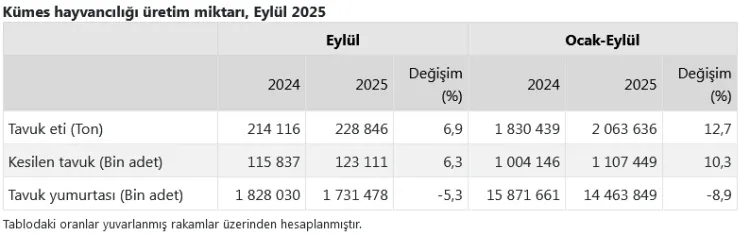 ANKARA (İGFA) - Türkiye İstatistik Kurumu (TÜİK), 2025 yılı Eylül ayına ilişkin kümes hayvancılığı üretim verilerini açıkladı.