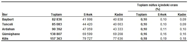 Nüfusu en az olan il ise 82 bin 836 kişiyle Bayburt oldu.