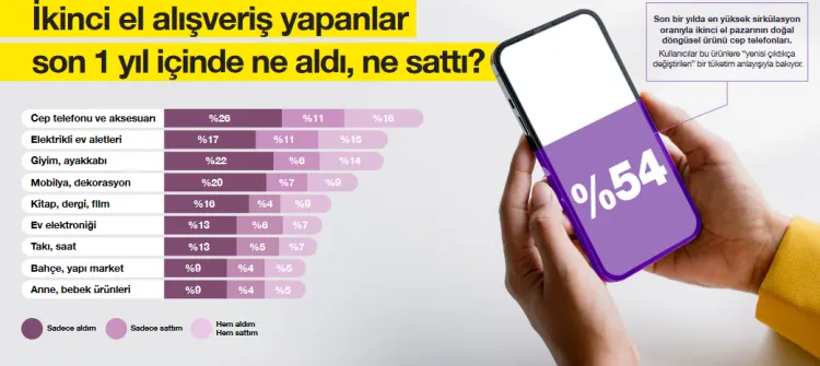 Araştırmaya göre, vatandaşların yüzde 45’i bir yıl içinde kıyafet, mobilya, cep telefonu veya beyaz eşya gibi ürünleri ikinci el olarak alıp sattı. sahibinden.com CEO’su Burak Ertaş, “İkinci el alışveriş artık toplumda yerleşik bir davranış haline geldi. Her iki kişiden birinin bu sürece dahil olması, döngüsel ekonominin güçlü bir karşılık bulduğunu gösteriyor” dedi.